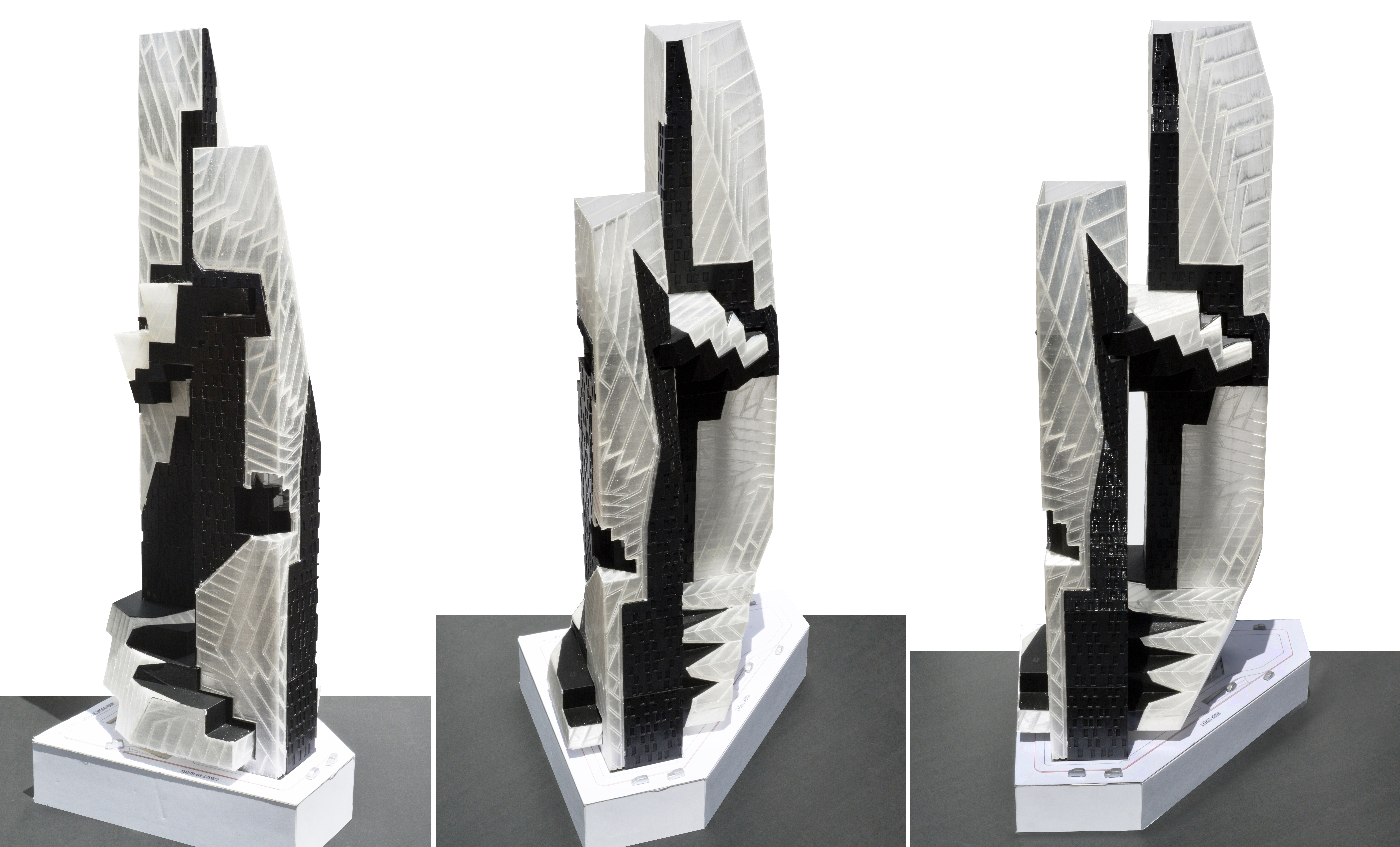 Rather than reflecting the local context, the two towers cast shadows on one another. These shadows are reified into a patchy building skin with massive dark figures that are as strong as the figures of the towers themselves. Because these figures run across mass edges and drift, They read as an independent third object rather than as a system of articulation. This patchy skin becomes two distinct facade types: a matte black anodized aluminum façade with punched windows, and a glass curtain wall with a pattern of large-scale joints.