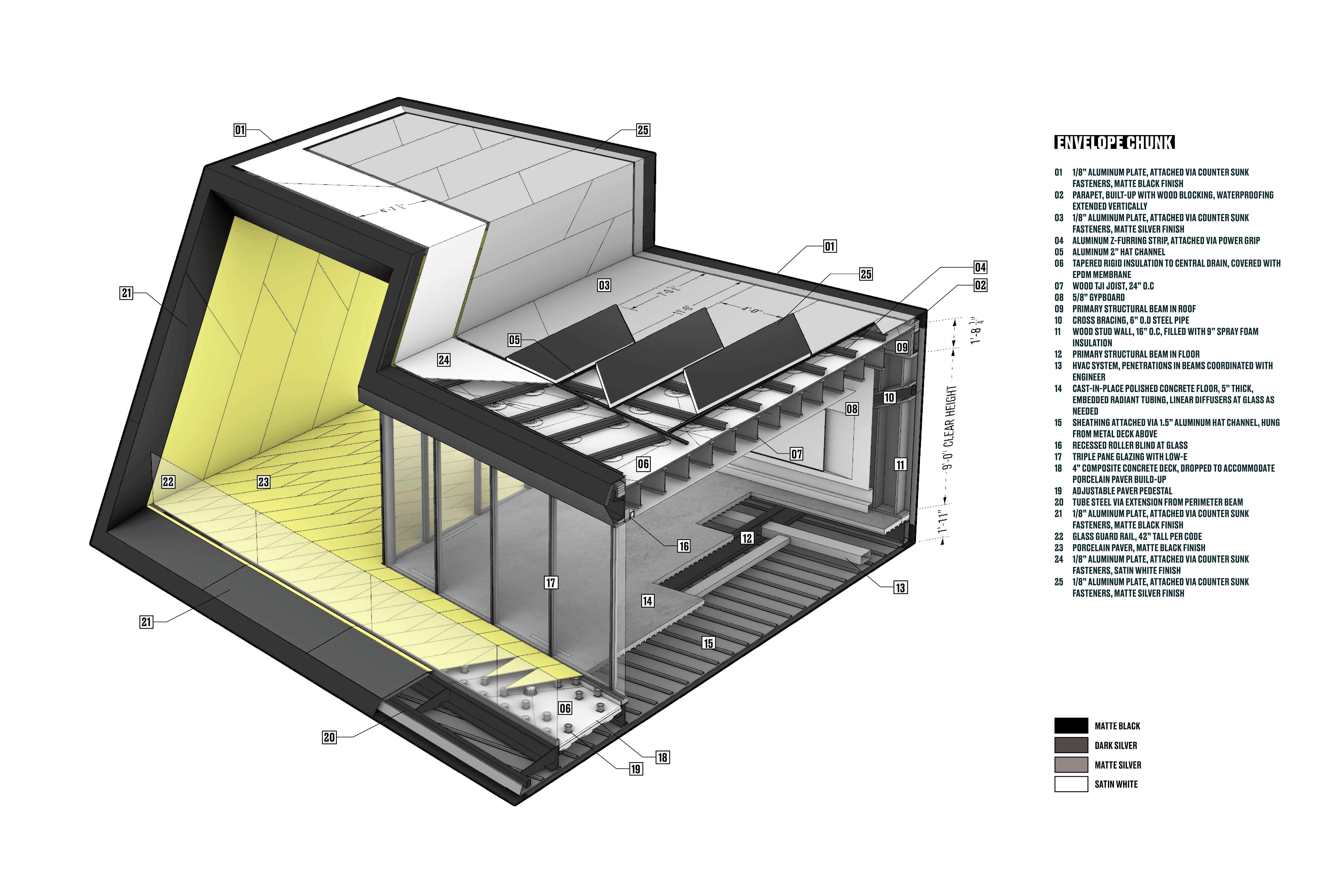 The parts, once assembled, are glance cut to create large apertures. These apertures stand in contrast to human-scaled windows, and feature inset glazed surfaces to provide decks. Black, white, and grey lines and fills emphasize this cut and the overall silhouette of the house, creating a cartoon-like effect and visual continuity across parts.