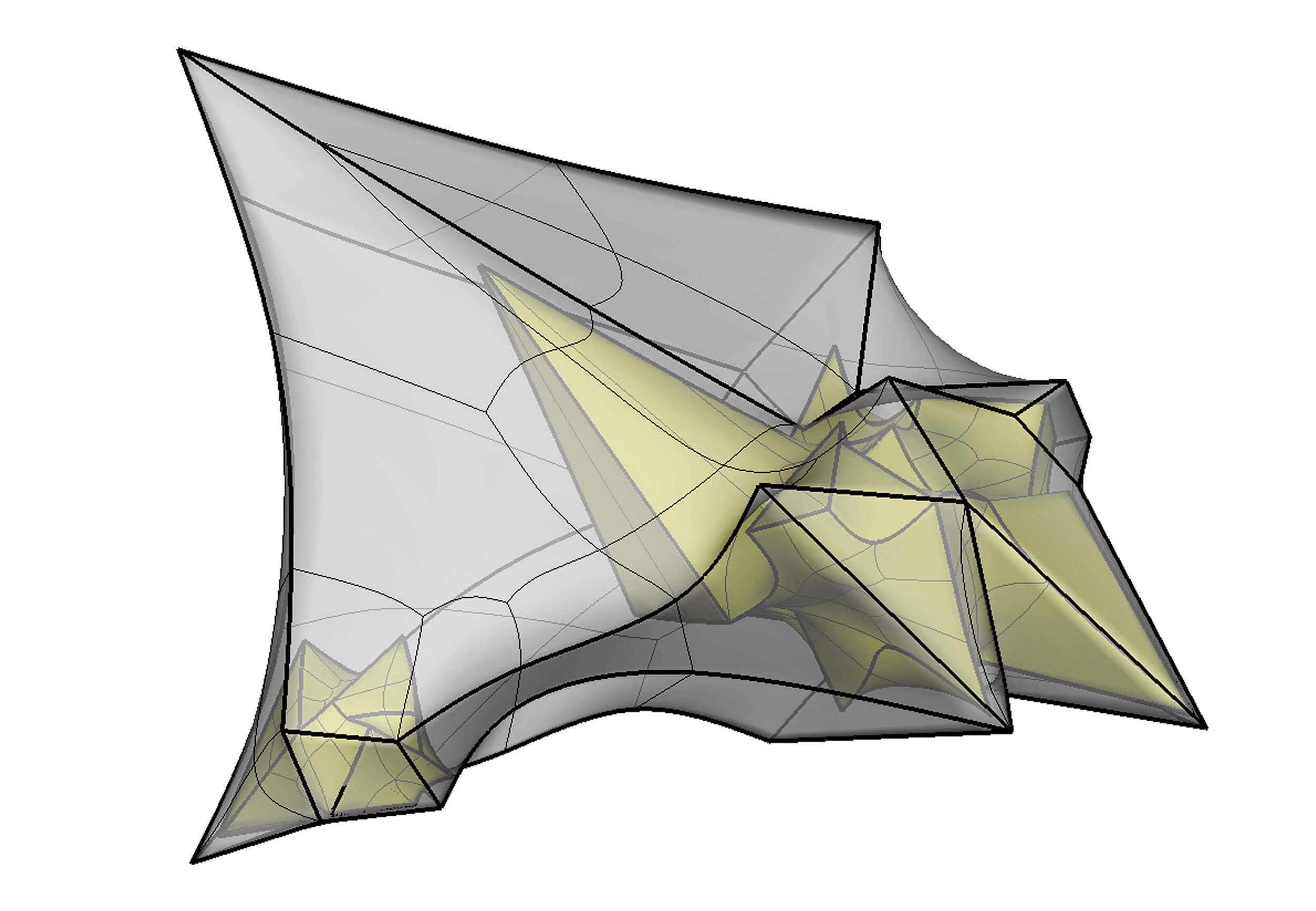 This project for the 2012 Venice Biennale began with the introduction of hard crystalline figures into a loose outer sack. Similar to the STRP Mutant series by Dutch artist Bart Hess, the sack is tightened over these figures so that their points and edges produce strange formal inflections that quickly fall off into a taut flatness.