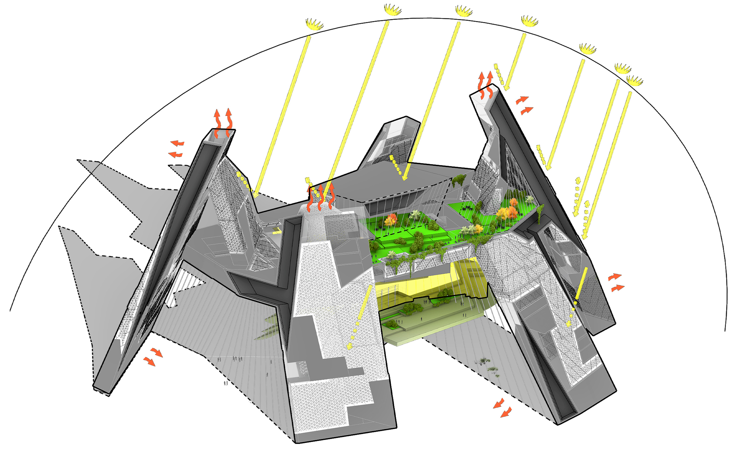 TWA’s extensive architectural experience in Europe translates into deeply integrated thinking about planetary energy as a basic element of good design, resulting in sophisticated, active and passive systems that are fully integrated into overall design concepts. This sometimes takes the form of inventing new technologies, such as facades with building-integrated solar systems, or designing whole buildings that create district-scale shade for urban spaces.