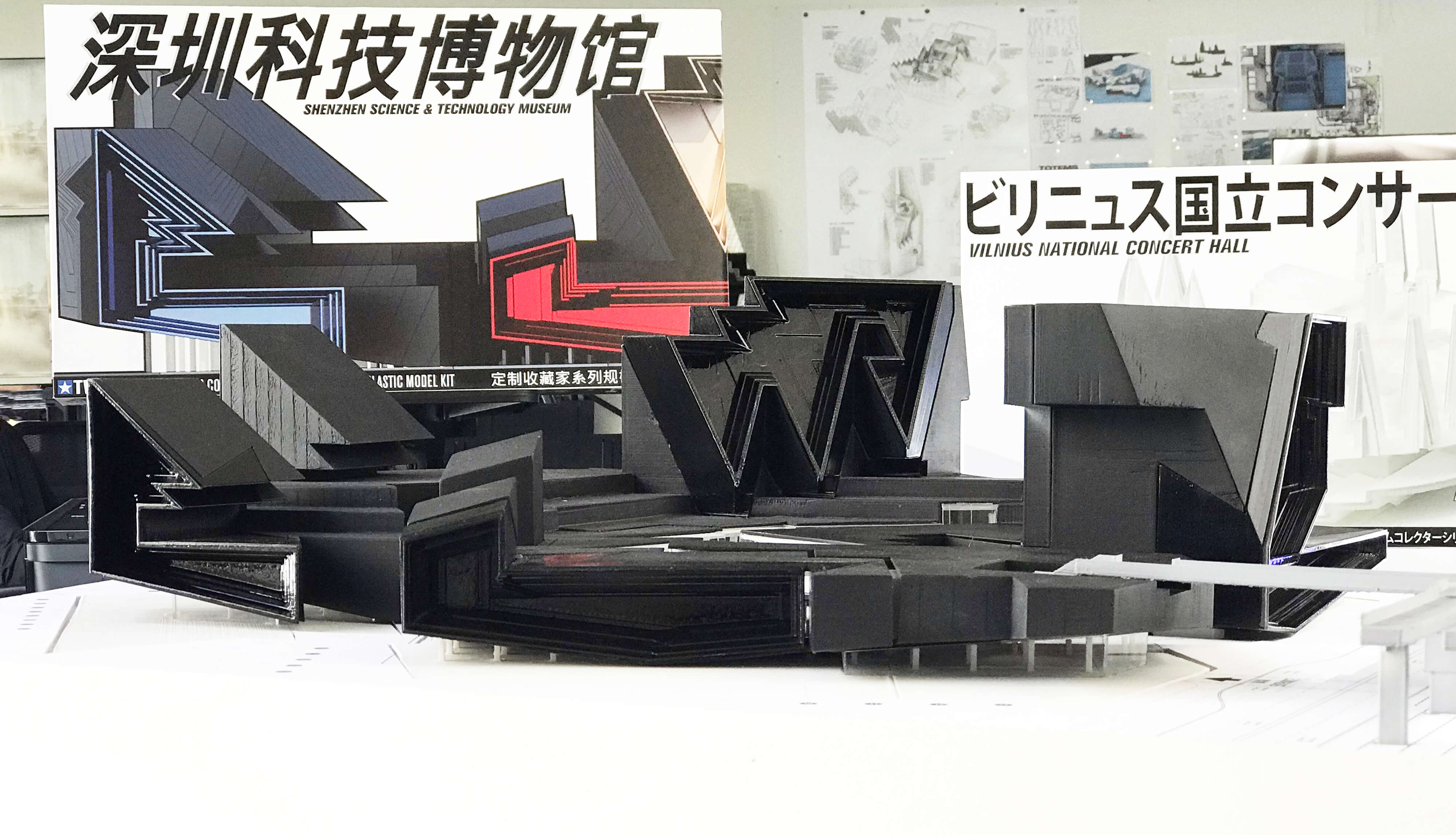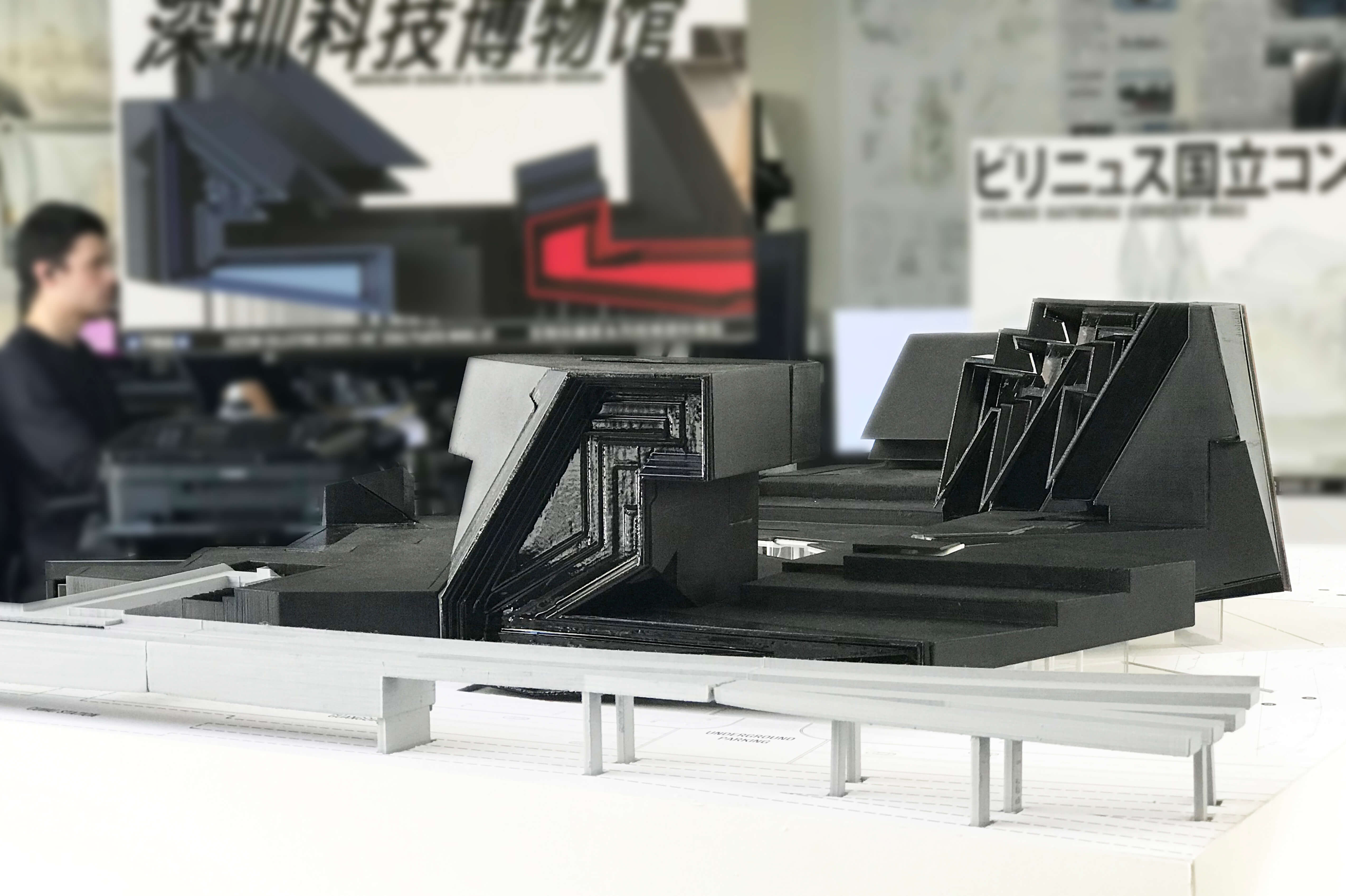 The mat building operates as the permanent exhibition space. It has tall ceilings and features a long-span, column-free space for flexible curation. A tear in the mat allows for daylight to enter the spaces while keeping the perimeter of the building opaque. The megaliths house special exhibitions in multi-level three-dimensional spaces which are crossed by bridges and feature circulation weaving up tall walls. These megaliths also serve to draw visitors up to the roof level, where they can roam among large things.